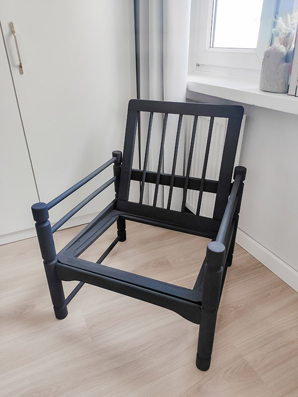 W szał malowania wpadłam i tak! Niesamowite, jak przy tym odpoczywam. Uratowałam ze śmietnika pod blokiem drewniany fotel. Drewno w bardzo dobrym stanie, tylko brudny niemożebnie, więc potraktowałam go naprawdę silnymi środkami czyszczącymi i odkażającymi. Jestem za to pełna podziwu dla pomysłowości w wykonaniu siedziska, które było zrobione na drutach! Fotel nie jest skończony – niedługo dodam pasy tapicerskie i nową poduchę, ale jeszcze nie wiem, w jakim kolorze. Z rozpędu pomalowałam też wszystkie drzwi w mieszkaniu. Z białego na biały, ale są pięknie odświeżone, no i malowałam swoją ulubioną farbą kazeinową, więc mają matową powierzchnię, którą uwielbiam.