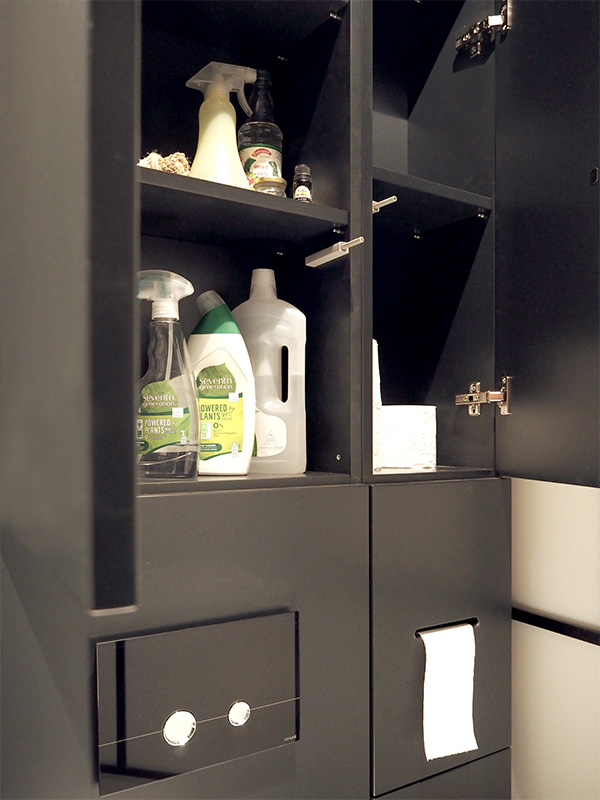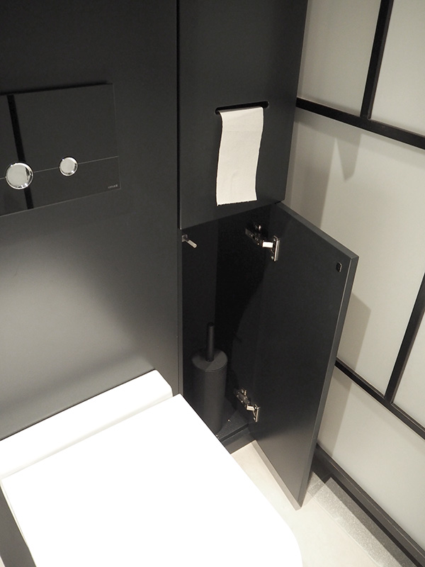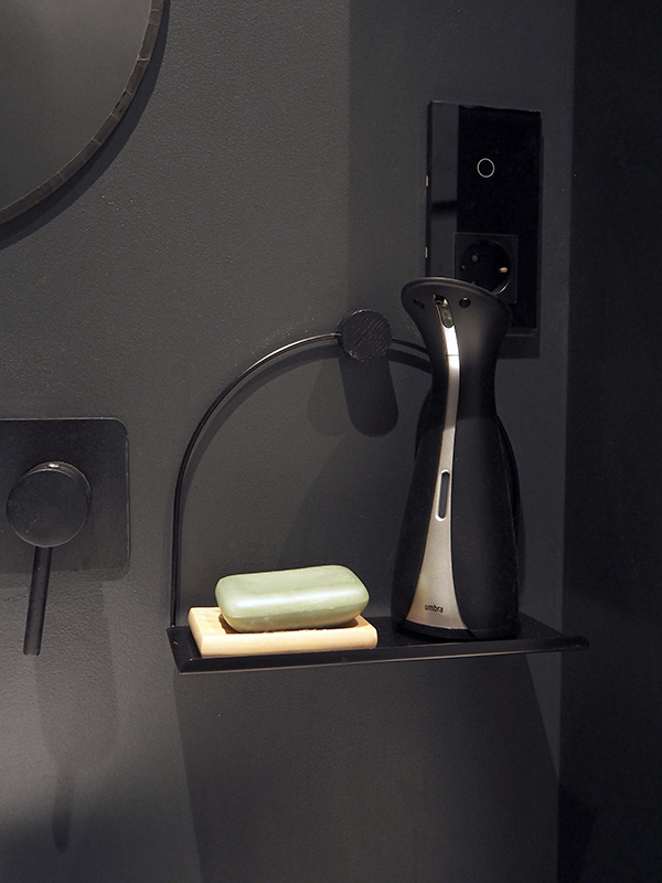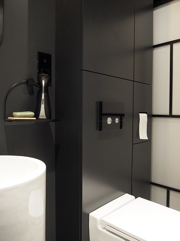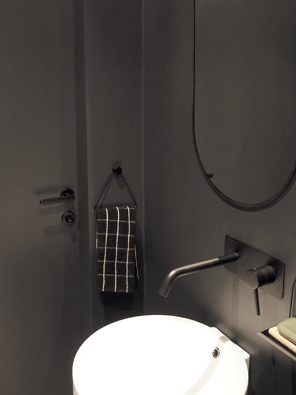Od razu wiedziałam, że chcę, aby toaleta była śmiała i cała czarna. Od zawsze podobały mi się takie wnętrza, ale nigdy nie miałam w sobie tyle odwagi, żeby zrobić np. całą czarną sypialnię – w naszym poprzednim mieszkaniu mieliśmy dwie czarne ściany, pamiętacie? Teraz poszliśmy na całość. W toalecie czarna jest większość elementów – przede wszystkim ściany, ale i baterie, dodatki oraz drzwi od wewnątrz.