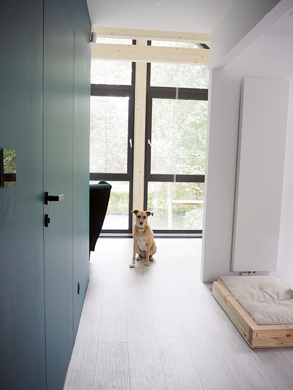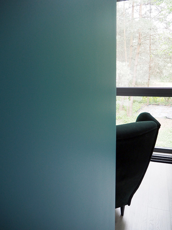 Ten kolor jest niesamowity – niezwykle trudno mi to pokazać na zdjęciach, ale w zależności od padającego światła potrafi przybrać odcień od niebieskiego do ciemnej zieleni. Cieszę się, że się na niego zdecydowaliśmy, bo płaski kolor mógłby nie odnaleźć się w przestrzeni, w której przez ogromne okna zewnętrze wchodzi do wewnątrz. Architektka uprzedzała nas przed nieostrożnym korzystaniem z zielonego koloru wewnątrz, bo może on konkurować ze zmieniającymi się odcieniami zieleni na zewnątrz. A u nas tej zieleni jest przecież mnóstwo. ?