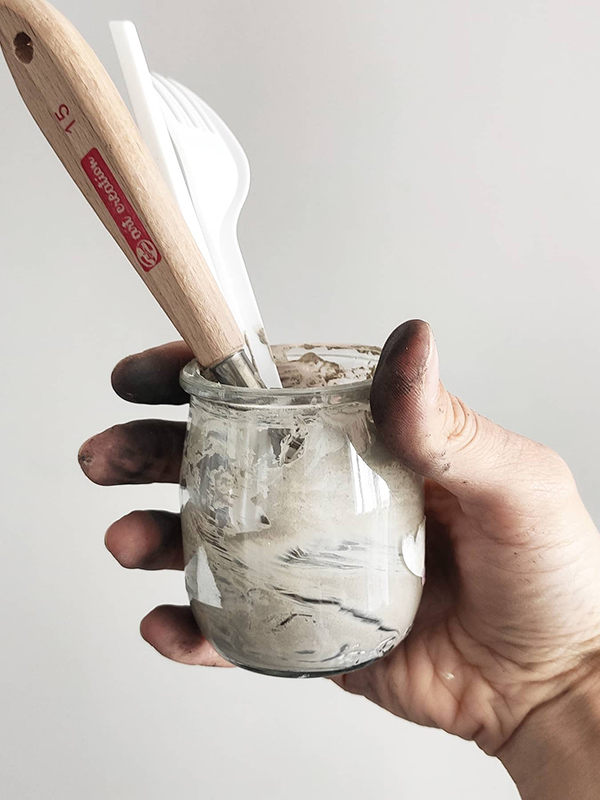 Jonna swoje eksperymenty zaczęła od piasku, ja od węgla drzewnego z ogniska i popiołu z domowego kominka „kozy”. Przygotowanie farby to 3 proste kroki: