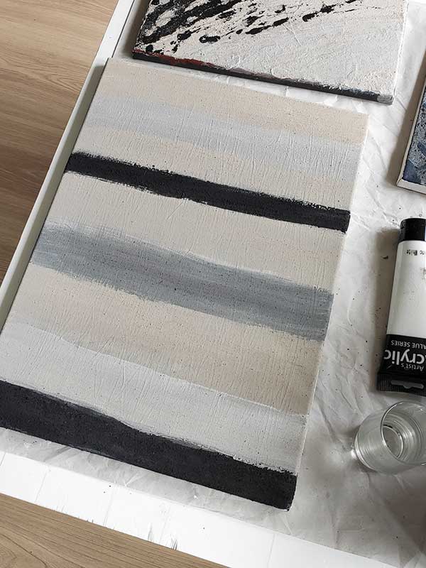3. Powstały pył w trakcie malowania dodaję do białej akrylowej farby. Mieszam pędzelkiem tuż przed nałożeniem na płótno. W zależności od ilości dodanego materiału kolory będą mniej lub bardziej nasycone, ale i konsystencja farby mniej lub bardziej gęsta. Zdarzało mi się już malować baaardzo gęstą farbą, pastą wręcz. Na obrazach poniżej opisuję czego i w jakim natężeniu użyłam.