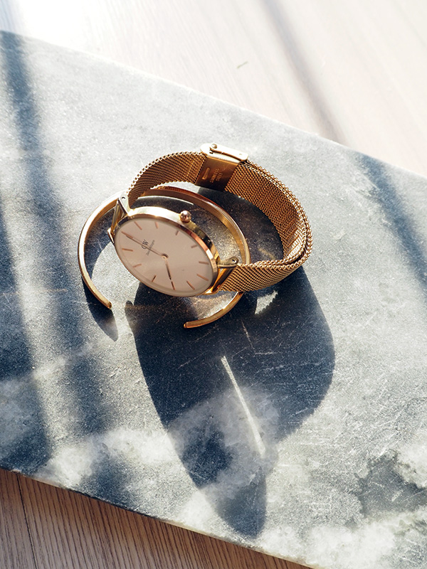 Po wielu latach noszenia srebra (jeszcze na studiach i tuż po) od długiego czasu jestem ogromną fanką złota, w tym różowego złota. Większość rzeczy pokazanych poniżej znacie doskonale, bo noszę je od bardzo dawna, na tyle długo, że już wielokrotnie pokazywałam je w zestawieniach. Zegarek Daniel Wellington z bransoletką tej samej marki to mój żelazny zestaw bodajże od końca 2014 roku.