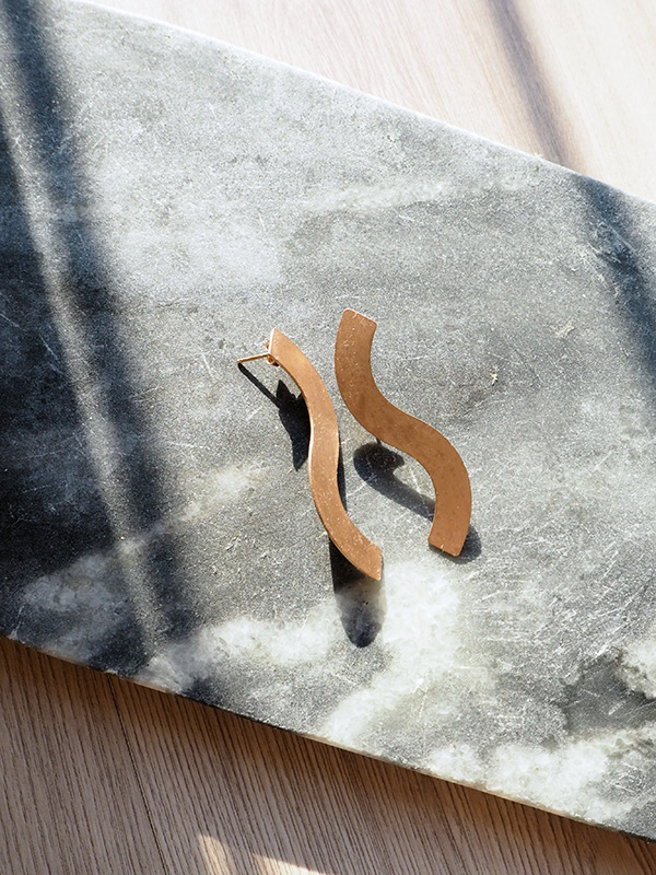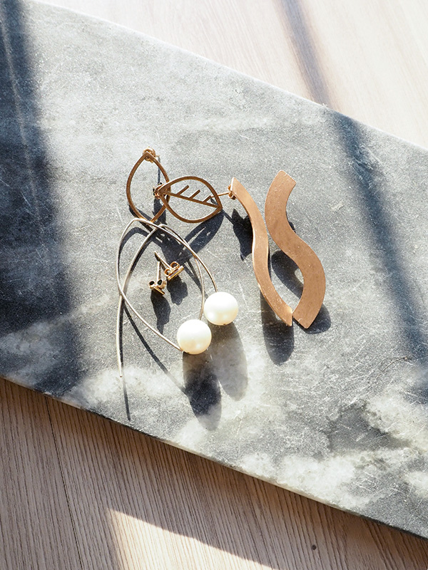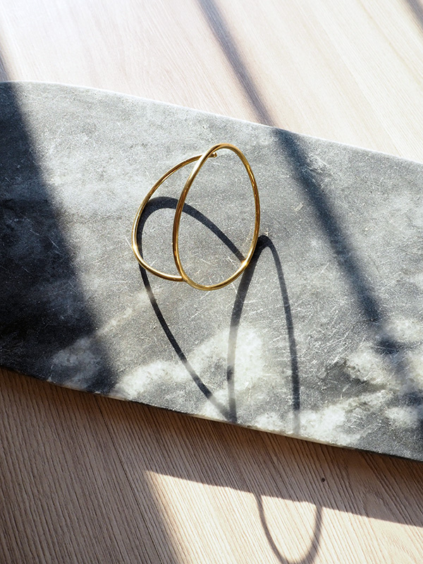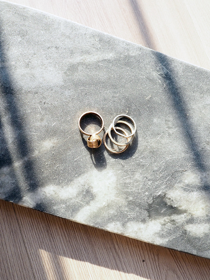 Większość kolczyków (poza perłami – to prezent, nie pamiętam jakiej marki) to projekty Kasi z KAVOdesign, których jestem ogromną fanką. Są to malutkie prostokątne sztyfty, listki i ostatni nabytek z zeszłego roku – FALISKA. Wszystkie są pozłacane różowym złotem. Także pierścionki obrączki to projekt KAVOdesign. Trochę mi się już wytarły od noszenia non stop. Duży pierścionek należał do mojej babci, przerobiłam go tylko trochę, żeby był bardziej nowoczesny. W oryginalnej wersji był zdobiony dodatkowymi ornamentami przy tej „plecionce”.
