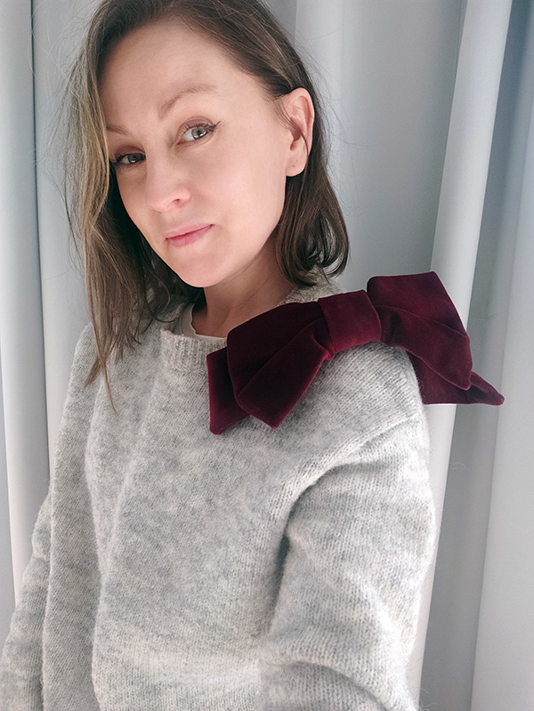 Dlatego superopcją jest dla mnie kokarda z tego samego aksamitu, tylko nie znalazłam jeszcze innego sposobu przypięcia jej do ubrania niż na ramieniu, jak proponuje Mavka. Macie może jakiś pomysł?