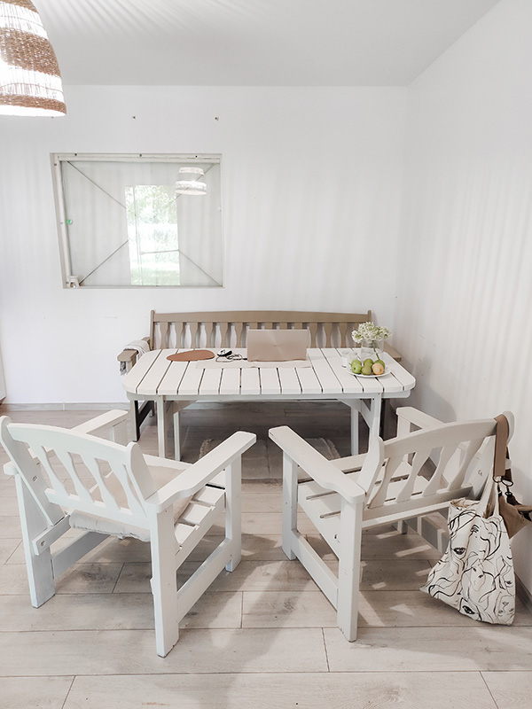 W domku są 3 pomieszczenia: na wejściu kuchnia ze stołem, obok sypialnia, a za drewnianymi przesuwnymi drzwiami część magazynowa z łazienką i łódką. :) Drewniany stół, ławki, fotele i szafka to moja duma – szlifowałam, czyściłam i malowałam je samodzielnie. Mam misję pozbycia się z tego wnętrza okrutnie brzydkiego brązu. Zostały mi jeszcze jedne drzwi, ale nie mogę się zdecydować czy pomalować je na biało czy szaro.