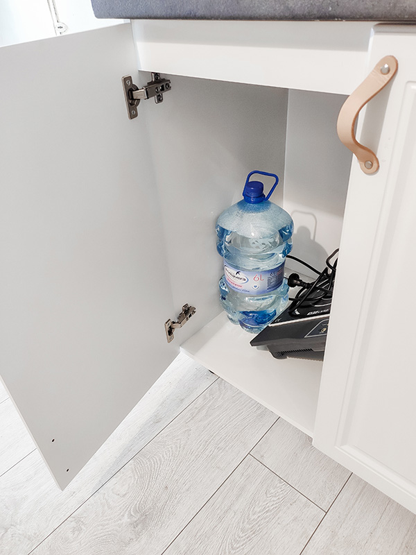 1. Wymieniłabym jeszcze blat na głębszy, ale na razie się nie pali. | 2. Kupiony na Allegro – szukaj po haśle „słój z kranem”. Zależało mi, żeby nie wyglądał jak słoik. | 3. Uwielbiam efekt, jaki daje zwykła zmiana uchwytów. Te są z Leroy Merlin. | 4. Zapasowa woda do picia – warszawska kranówka.