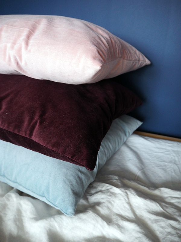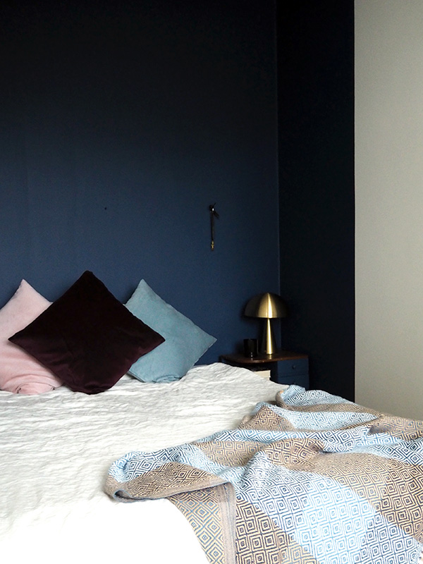 Ciemne tło warto wizualnie rozświetlić (choć „total dark look” też bywa piękny). W mojej sypialni rolę rozświetlacza pełni oczywiście złota lampa, ale i odcienie poduszek – jasny błękit oraz róż. Zmiana koloru tylko tych dodatków sprawi, że zmieni się postrzeganie całej przestrzeni. Wyobraźcie sobie proszę to wnętrze z ciemną pościelą zamiast białej i granatową poduszką zamiast błękitnej. Sporo inspiracji jak może wyglądać granatowa sypialnia w innym stylu znajdziecie tutaj: styl klasyczny, styl nowoczesny, wersja monochromatyczna;