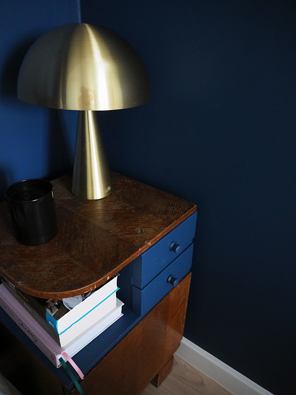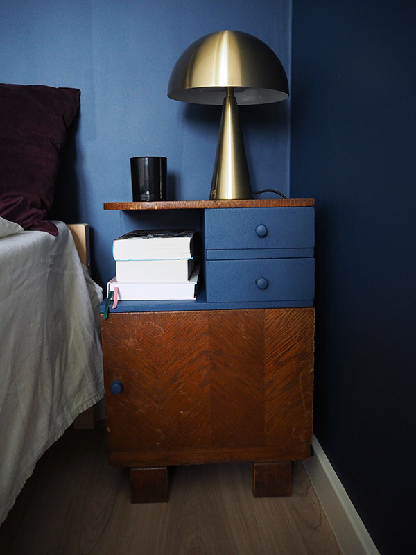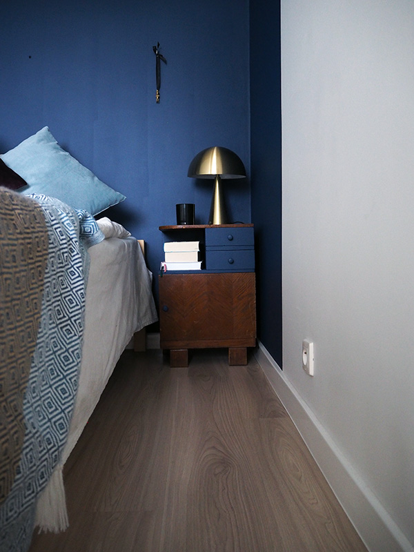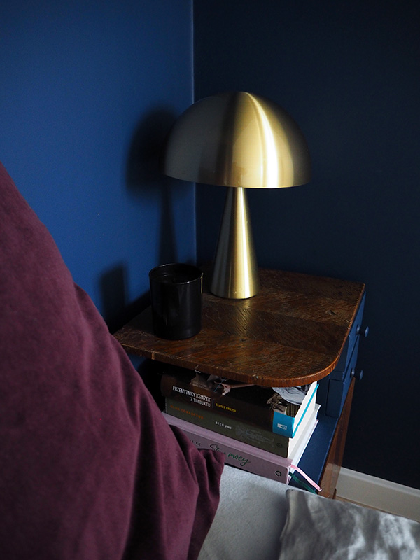 Po czwarte i ostatnie, wnętrze ogrzewa również ciemny i ciepły odcień drewna szafki. Nie jestem fanką ciemnego drewna i w pierwszej kolejności chciałam pomalować całą szafkę na granat, ale zmieniłam zdanie. Jest piękna w swojej niedoskonałości. Wabi sabi. Ponieważ mieszkam sama, jedna szafka nocna jest w zupełności wystarczająca. ;)
