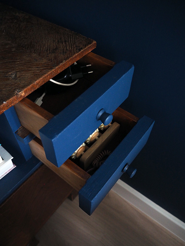 Kolor na ścianie to odcień Granat pierwsza klasa Dulux. Po raz pierwszy od lat zdecydowałam się na inną farbę, niż sprawdzony Magnat czy Śnieżka, ponieważ podobał mi się ten konkretny odcień, a nie chciałam eksperymentować z farbami z mieszalnika. Kolor nadal robi przepiękne wrażenie, ale farba w kładzeniu była dużo gorsza i trudniejsza – łatwo zrobiły się smugi, a zmywalność nie do końca jest taka bezproblemowa.