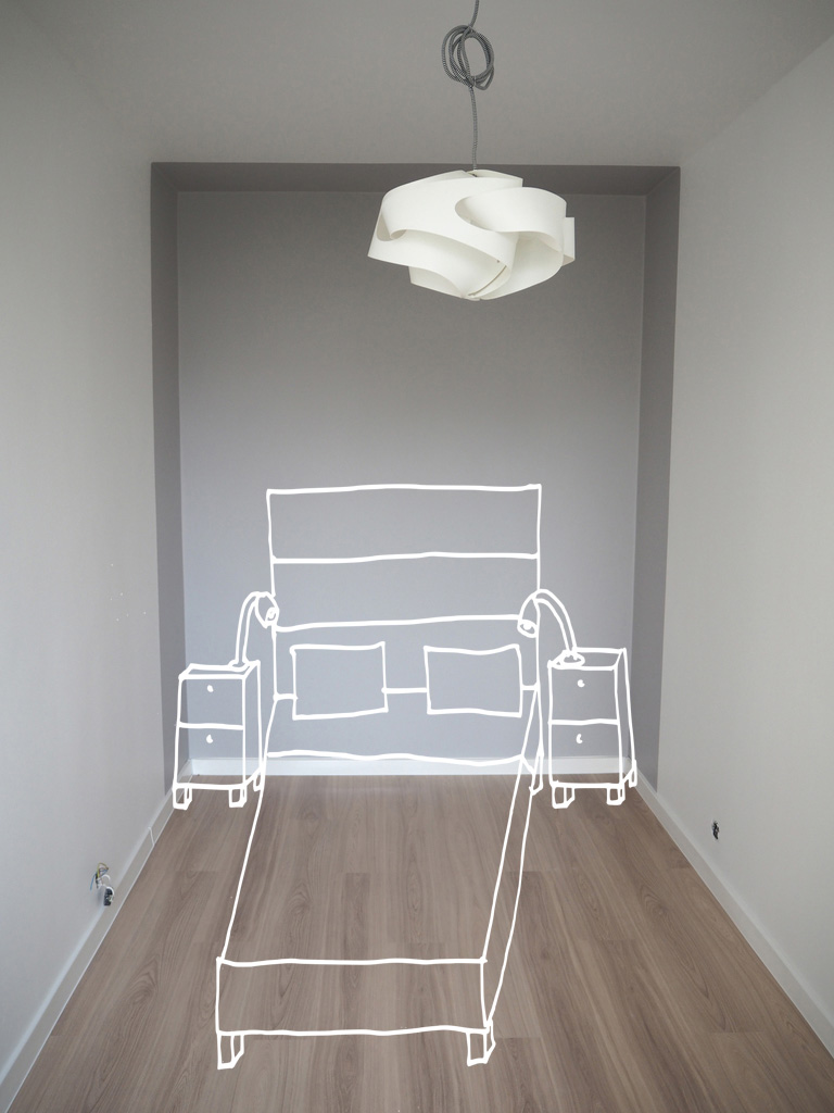Postanowiłam również wykorzystać posiadane rzeczy, których nie oddałam i nie sprzedałam właśnie po to, żeby być może wykorzystać w tym projekcie. Przykładowo, jest to zagłówek, który kiedyś zrobiliśmy własnoręcznie (w czasach, gdy spaliśmy na samym materacu). Po kupieniu łóżka wykorzystaliśmy tylko jeden element zagłówka, trzy pozostałe zostały spakowane i zamierzam je wykorzystać właśnie teraz.