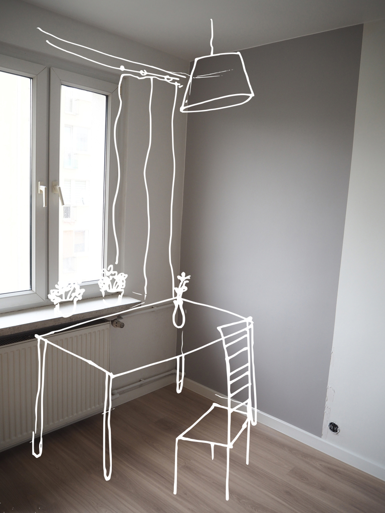 Kolorystyka, oczywiście, jak najbardziej neutralna. Wiem, że Wy również, a i ja też doświadczyłam kolorystycznego chaosu w wynajmowanych mieszkania. Pasteloza czyli obrzydliwe odcienie zieleni, pomarańczu czy żółci lub uderzający po oczach fiolet lub czerwień to najczęstsze błędy po stronie wynajmujących. Dlatego postawiłam na jak najbardziej neutralne odcienie bieli i szarości, ale wykorzystanej w nieco nietypowy sposób (zwłaszcza w sypialni). Podpatrzyłam to rozwiązanie na Instagramie i w nieinstagramowej rzeczywistości sprawdza się równie pięknie! Sprawia, że wydzielona na łóżko część pokoju jest przytulna i zaciszna. I jest to banalnie proste rozwiązanie. W razie plam i zniszczeń wystarczy pomalować na nowo. Podobnie została wydzielona część jadalniana pod oknem. Póki co, przedstawiam Wam częściowe wizualizacje, ponieważ meble nie zostały jeszcze ustawione. Ale już wygląda to pięknie!