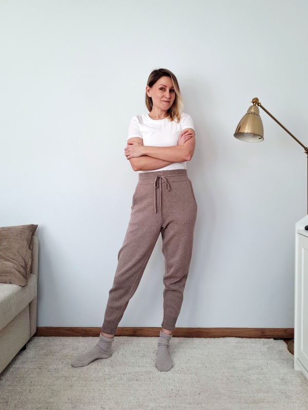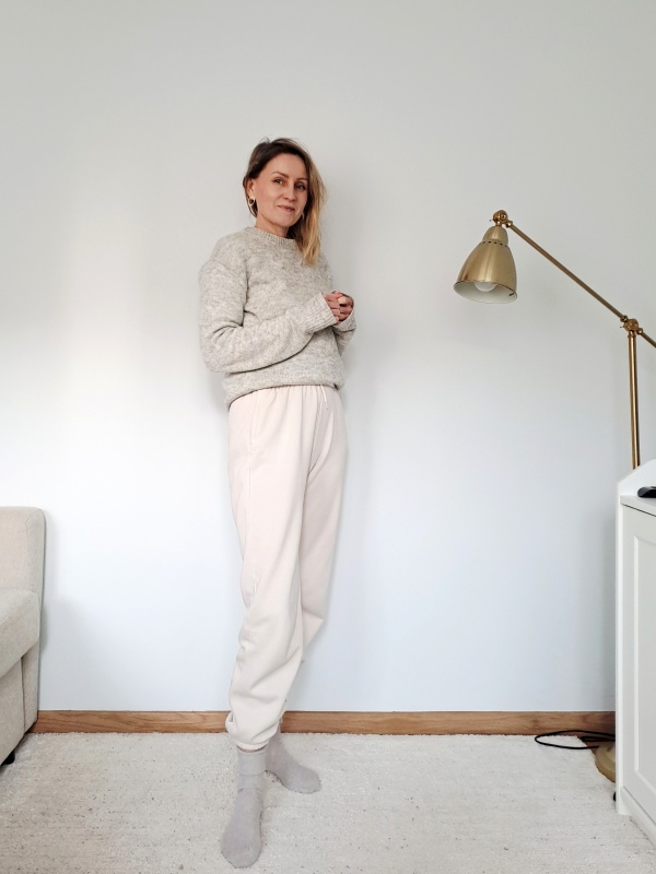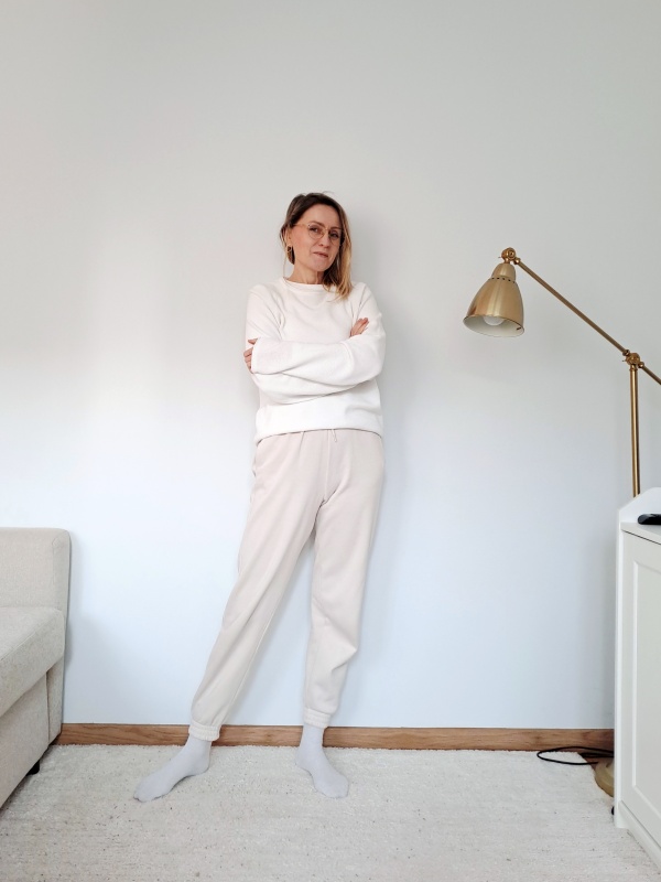 Mindfulnessowy mundurek. Jego bazą są jasne bawełniane dresy, zmienia się tylko góra.