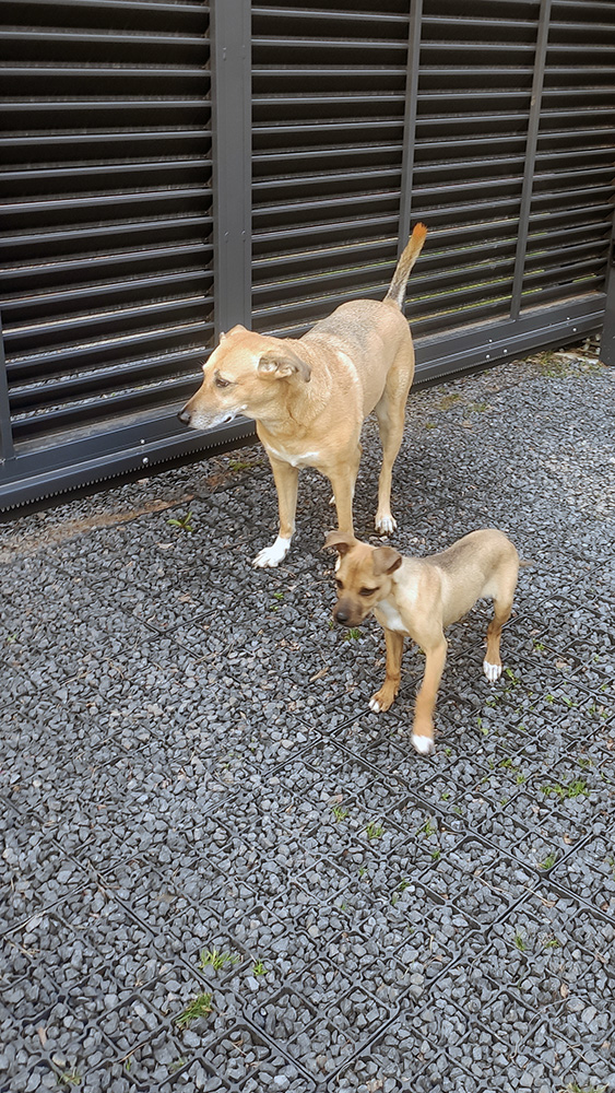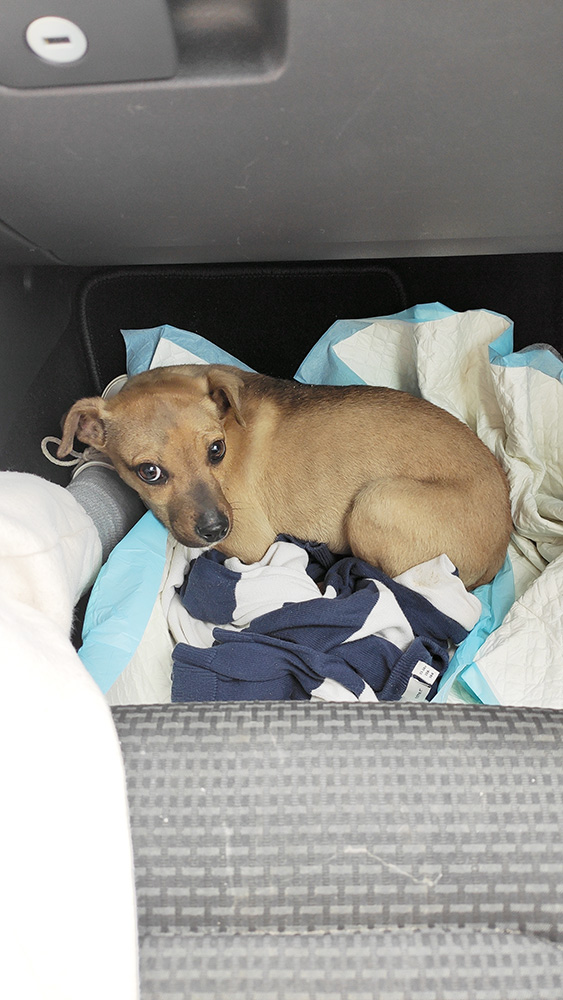 Gdy w kwietniu pojechałam obejrzeć działkę i domek, w środku, pod prysznicem, znalazłam… psa. Maleńką suczkę, która najprawdopodobniej od paru tygodni błąkała się samopas (wiem z doniesień zaprzyjaźnionego wędkarza, który ją dokarmiał). Była dosłownie sztywna ze strachu, gdy ją podniosłam. Zabraliśmy ją do weterynarza, daliśmy ogłoszenie itp. Nikt nie szukał, więc trafiła pod opiekę stowarzyszenia, z którym współpracuję, a na szczęście mój eks jest ostro w trybie „Violetta Villas” i żadnemu szczeniakowi nie odmawia. :) Gdy tylko przywieźliśmy ją do Neli, to padliśmy ze śmiechu. To jest mini-Nela! Są identyczne – wyglądają tak samo, mają identycznie białe końcówki łapek, burczą tak samo i nawet tak samo przekrzywiają łepek, gdy się do nich mówi. :) Poszło info, że szukam dla niej domu, i to była chyba najszybsza adopcja na świecie. Michał, jeden z właścicieli firmy Svobo, która stawiała mój eksdom w lesie, napisał, przyjechał, wziął, pokochał. Ot, taka historia z podwójnym happy endem. :)
