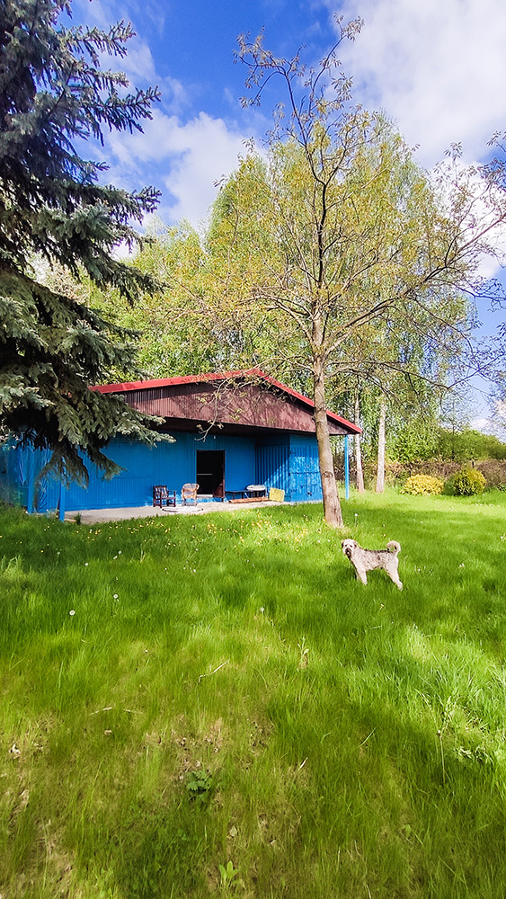 Sam domek to połączone kontenery. Postawione ze 30 lat temu, gdy nikt nie myślał, że będzie taki hype na domki z kontenera jak teraz. To taki kontener vintage, nawet kolor ma oryginalny. :) Chewie klepnął, wytarzał się w kupie na powitanie, a przy każdej okazji przeciska się przez szczebelki furtki i zaraz jest na gigancie. Dzieci…