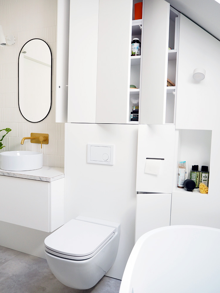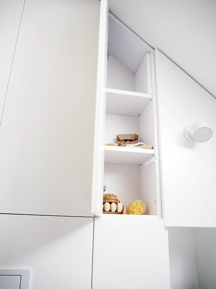 Cała zabudowa jest wykonana na zamówienie przez stolarza z płyty mdf lakierowanej na biało w wersji matowej. Moje ulubione rozwiązanie (poza suszarką do włosów) to chowana szczotka do ubikacji i zabudowany uchwyt na papier toaletowy.