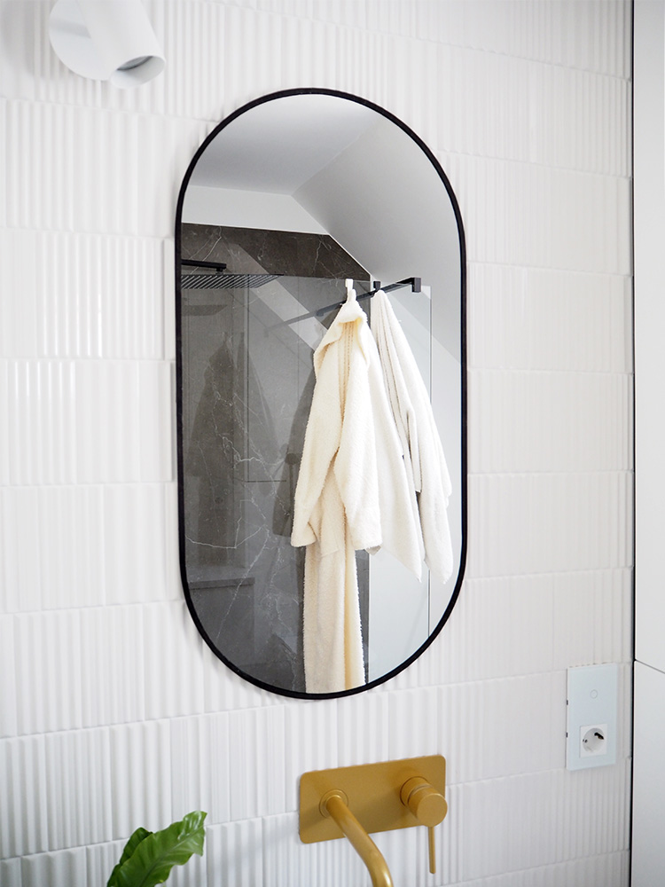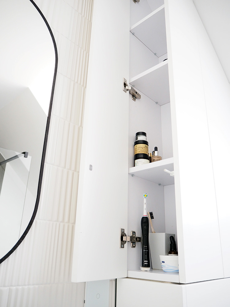 Bardzo nie lubię, gdy kosmetyki i inne przybory leżą wiecznie na wierzchu, a w naszej poprzedniej łazience niestety tak było. Oczywiście mieliśmy super szufladę do przechowywania pod blatem, ale odkładanie tam rzeczy na bieżąco nie było wygodne i finalnie tego nie robiliśmy. Nie chcieliśmy popełnić tego samego błędu, dlatego od samego początku przeanalizowaliśmy jakich przedmiotów i kosmetyków używamy najczęściej i gdzie będzie najwygodniej po nie sięgać.
