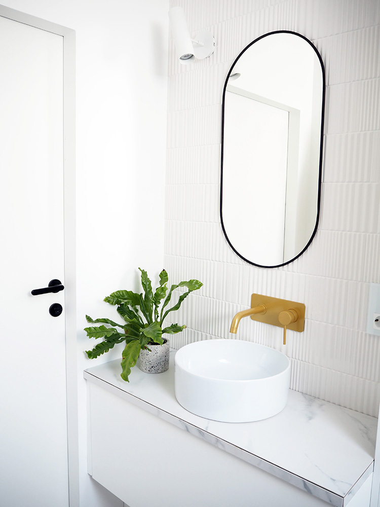Ostatni element „stały” to baterie. Baterii szukałam bardzo długo. Te zaproponowane przez architektkę kosztowały w sumie prawie 10 000 zł! (słownie: dziesięć tysięcy złotych, to nie żart), a to tylko wycena baterii umywalkowej i wannowej. Inna znana marka była bardziej dostępna cenowo, ale czas oczekiwania to 6 miesięcy! Finalnie, wszystkie baterie pochodzą z jednej polskiej firmy, która zrobiła je na zamówienie w znośnej cenie. Wyglądają ok, choć nie jestem do samego końca zadowolona z tego złotego odcienia, ale postanowiłam się tym po prostu nie przejmować (tak, wąż jest jeszcze tymczasowy). Cóż, czasami się nie trafi, ale z daleka wyglądają superaśnie i pięknie kontrastują z resztą elementów. ;)
