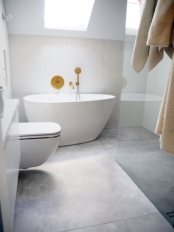 Podsumowując, jestem bardzo zadowolona z naszej łazienki i poczynionych wyborów. Korzystamy z niej już drugi miesiąc i nie mamy żadnych „to zrobiłabym inaczej”, może poza prysznicem – kabina jest dużo większa, niż nam się wydawało, że będzie! :) Planowałam specjalną półkę na wannę, żeby móc w niej czytać, ale widok na gwiazdy przez okno połaciowe jest zbyt rozpraszający. ;)