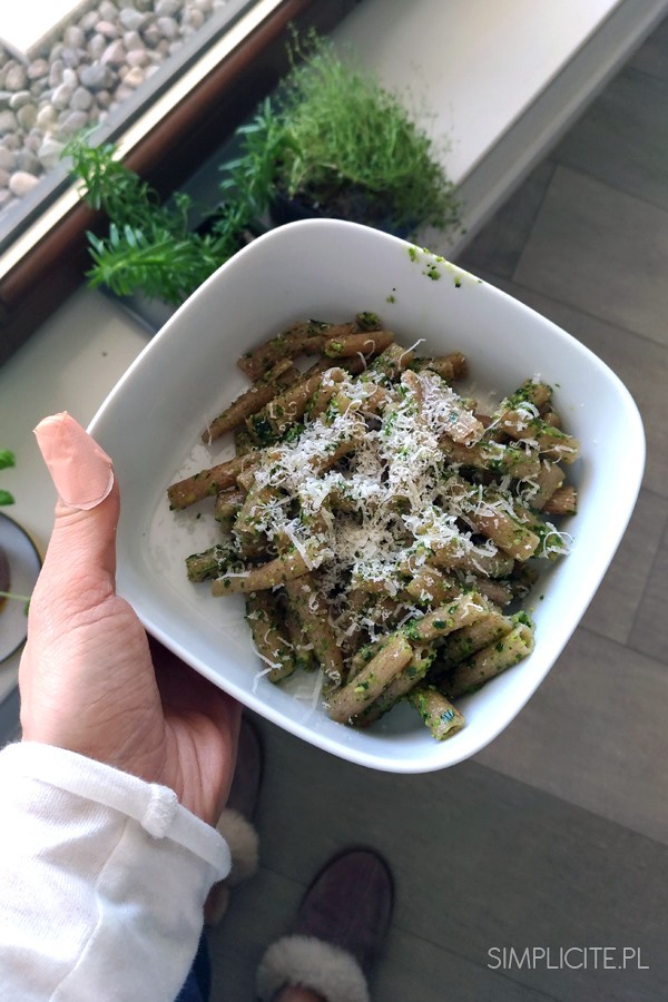 - Obiad/kolacja to wariacje na temat risotto lub kaszotto z warzywami, ewentualnie z dodatkiem kurczaka. Alternatywnie często jem domowe pesto z pietruszki lub bazylii z makaronem razowym, a jak już zupełnie nie mam czasu to gotowe zupy warzywne, które kupuję w Biedronce (świetny skład!).