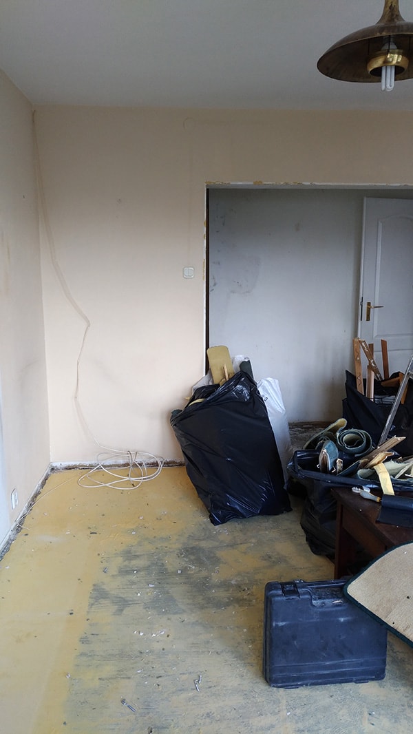 Nie zamierzamy ruszać żadnych ścian działowych, ani wprowadzać poważnych zmian w układzie mieszkania. Główne elementy remontu to położenie podłóg we wszystkich pomieszczeniach, doprowadzenie ścian do porządku i wymiana sprzętów. Potencjalnie najwięcej pracy renowacyjnej będą wymagały kuchnia oraz łazienka, ale tutaj zakres remontu uzależniam od stopnia wykorzystania budżetu po położeniu podłóg i pracach ściennych. O ile ściany nie powinny sprawić niespodzianki, to podłoga jest jedną wielką niewiadomą. Dopiero po ściągnięciu warstw wykładziny i linoleum zobaczymy, z czym mamy do czynienia.