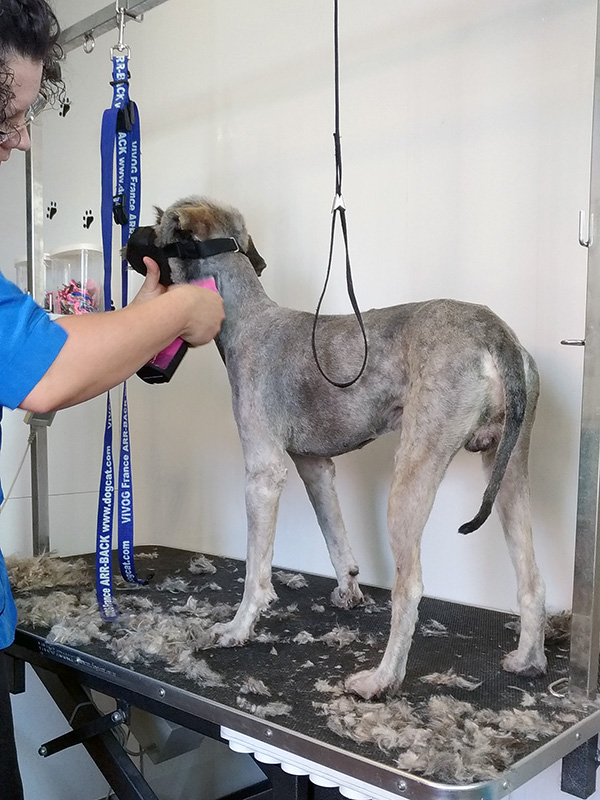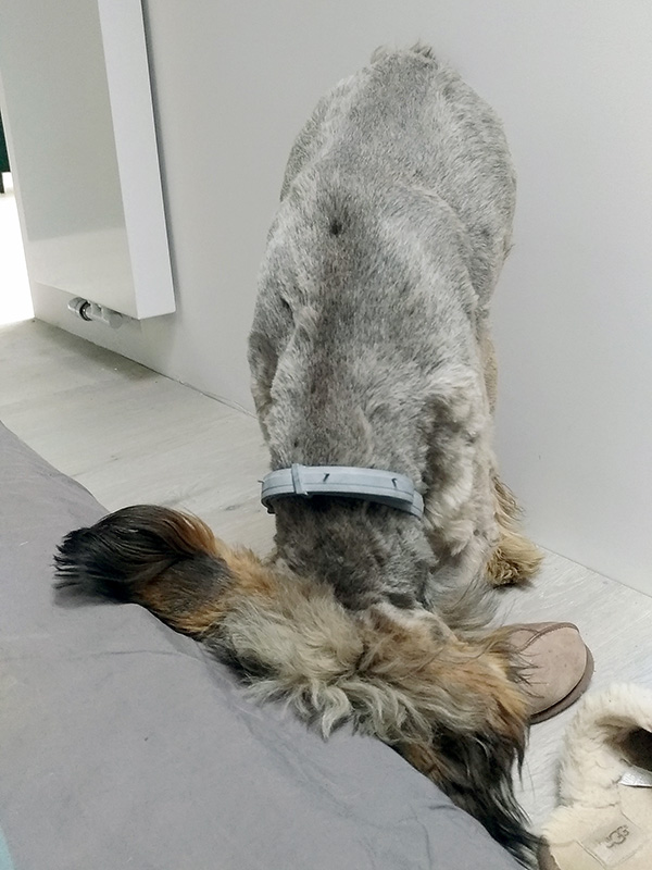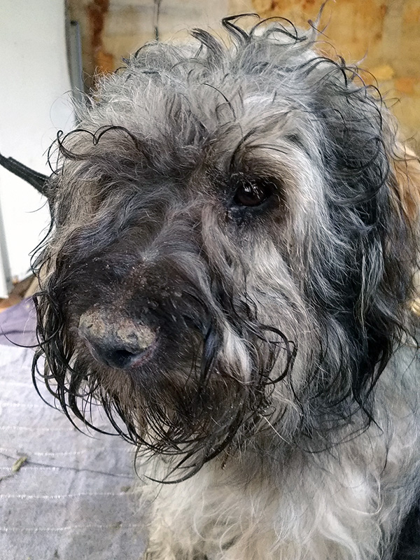 Następnego dnia zrobiłam mu zdjęcia i zabraliśmy go do weterynarza we wsi obok. Na terenie gminy działa stowarzyszenie na rzecz bezdomnych psów, które wzięło go pod opiekę. Na drugą noc został u weterynarza. Okazało się, że to bardzo młody psiak. Ma rok lub dwa. Zbadali go, odrobaczyli, wyjęli kilkadziesiąt kleszczy, wbiły mu się wszędzie, też przy oczach. Chipa też nie miał, rzecz jasna. W międzyczasie wrzuciłam zdjęcia do mediów społecznościowych, na lokalne grupy itp. Mogło się przecież okazać, że ktoś go szuka. Nic szukał. Zaskakujące, że przy takim zakleszczeniu badania krwi wyszły zupełnie czyste. Nie mogliśmy przestać się śmiać, gdy Chewie wrócił taki częściowo ogolony. Nie było wyjścia, sierść miał w fatalnym stanie. Umówiliśmy się z weterynarzem, że weźmiemy go do siebie na tymczas.