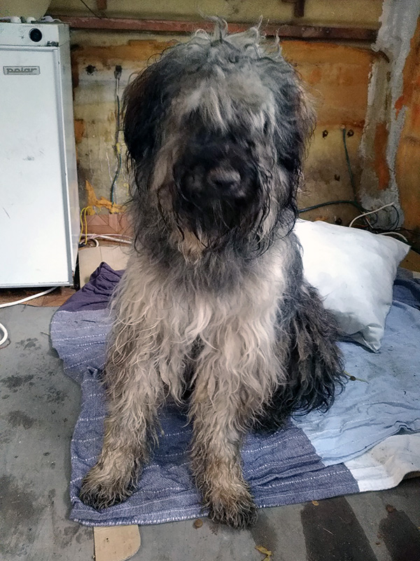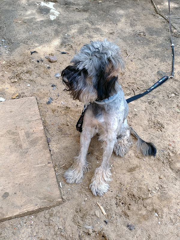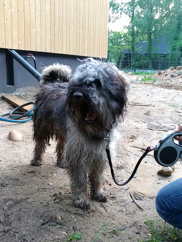 Potem spotkaliśmy go w okolicy ze 2 razy. Nie pozwalał się zbliżyć. Był tak kudłaty, że nie było widać czy ma obrożę. Nie byłam też w stanie rozpoznać czy to pies czy suczka. Próbowałam podejść – uciekał od razu. To był czas majowych burzy. Przez kilka kolejnych dni nie mogłam znieść myśli, że to małe stworzonko kryje się gdzieś przed piorunami w lesie. Szukaliśmy go w deszczu. Chodziliśmy po leśnych ścieżkach. Jeździliśmy rowerem i samochodem po okolicy. W kieszeni i w aucie trzymałam psie chrupki na wszelki wypadek. Znaleźliśmy jego kryjówkę w pustostanie w budowie. Ktoś postawił mu miskę z wodą i jedzeniem.