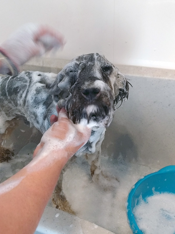 Po szczepieniach zabraliśmy Chewiego do psiego fryzjera, skąd wyszedł… zupełnie inny pies! Fryzjerka powiedziała mi kilka ciekawych rzeczy. Przede wszystkim Chewie to 2/3 sznaucera i 1/3 terieropodobna. Bardzo prawdopodobne, że jako szczeniak wygladał jak york, co by mogło tłumaczyć jego historię. Bardzo możliwe, że ktoś kupił yorka z pseudohodowli, który nagle urósł i cóż, trzeba było coś z nim zrobić. Pomimo, że jego wygląd na to nie wskazywał, to wydaje nam się, że Chewie nie błąkał się samopas dłużej, niż kilka dni. Wcale nie jest taki strasznie lękliwy – boi się podniesionej ręki, ale tylko wtedy, gdy coś w tej ręce trzymam. Nie lubi też głośnych dźwięków i bardzo boi się burzy. Jedną z burzliwych nocy spędziłam z nim na schodach, bo tam czuł się najbezpieczniej.