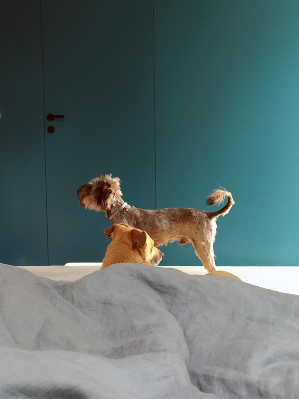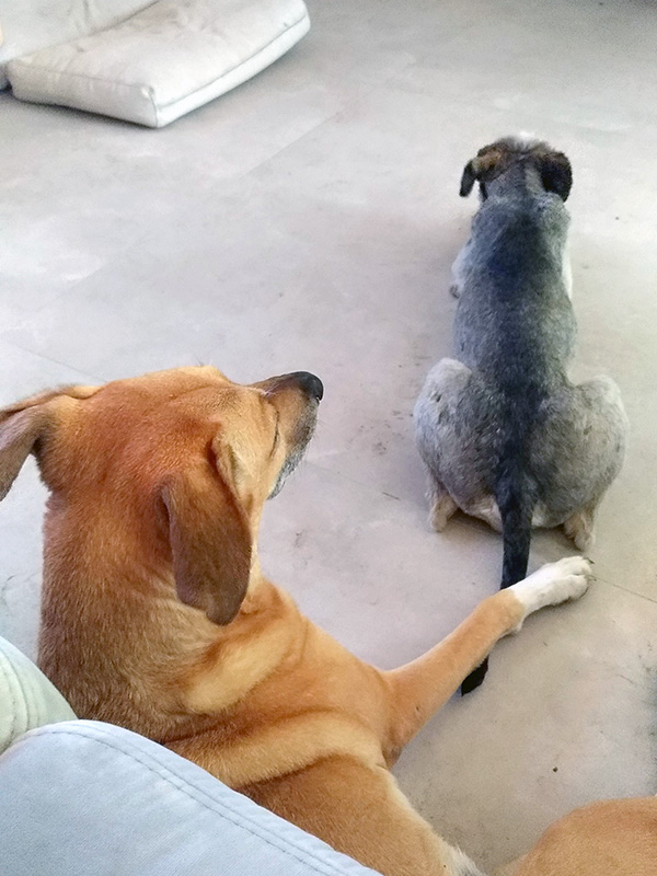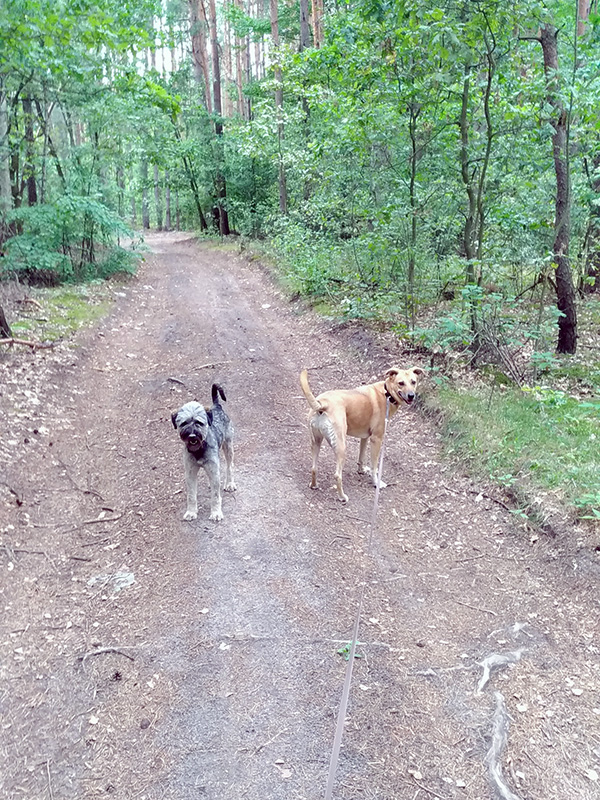 Trochę baliśmy się jak zareaguje Nela. Robiliśmy już jedno podejście do drugiego psa. Rozważaliśmy wzięcie Bingo – psa, którego poznaliśmy w trakcie spacerów w Azylu pod Psim Aniołem. Mimo, że wtedy zrobiliśmy wszystko jak należało, psy nie przypadły sobie do gustu, zaatakowały się od razu. Baliśmy się jak będzie z Chewiem. Był 3 razy mniejszy od Neli, mogła go pogryźć bez problemu. Na szczęście, Chewie okazał się tak uroczy, że urabiał sobie Nelę z dnia na dzień. Zdarzyło się między nimi kilka incydentów, ale absolutnie nic poważnego. Przede wszystkim musieliśmy zwracać dużą uwagę na nie faworyzowanie nowego. Nela jest dużo mnie przytulasta, więc nie było łatwo, ale staraliśmy się obdzielać uwagą psy po równo, z przewagą dla Neli. Nie nazwałabym ich przyjaciółmi, mają zupełnie inne usposobienie, ale dogadują się bez problemu i uczą wzajemnie różnych rzeczy, nie zawsze tych godnych nauki. ;)