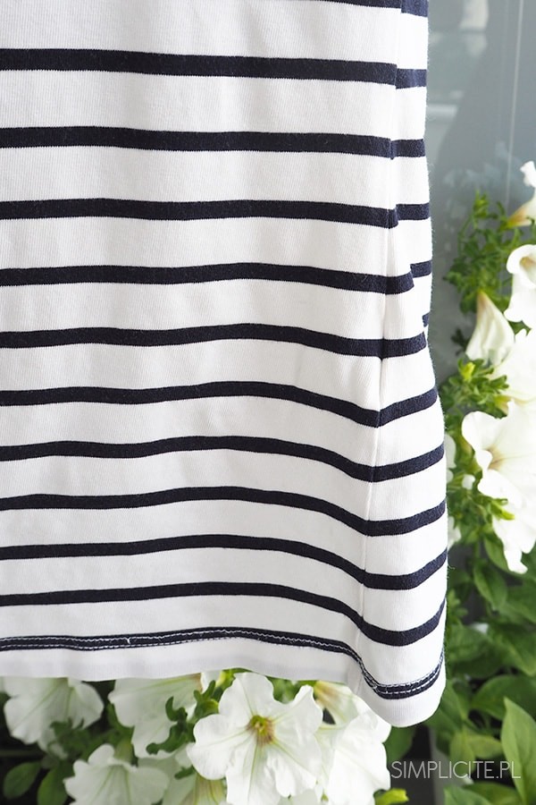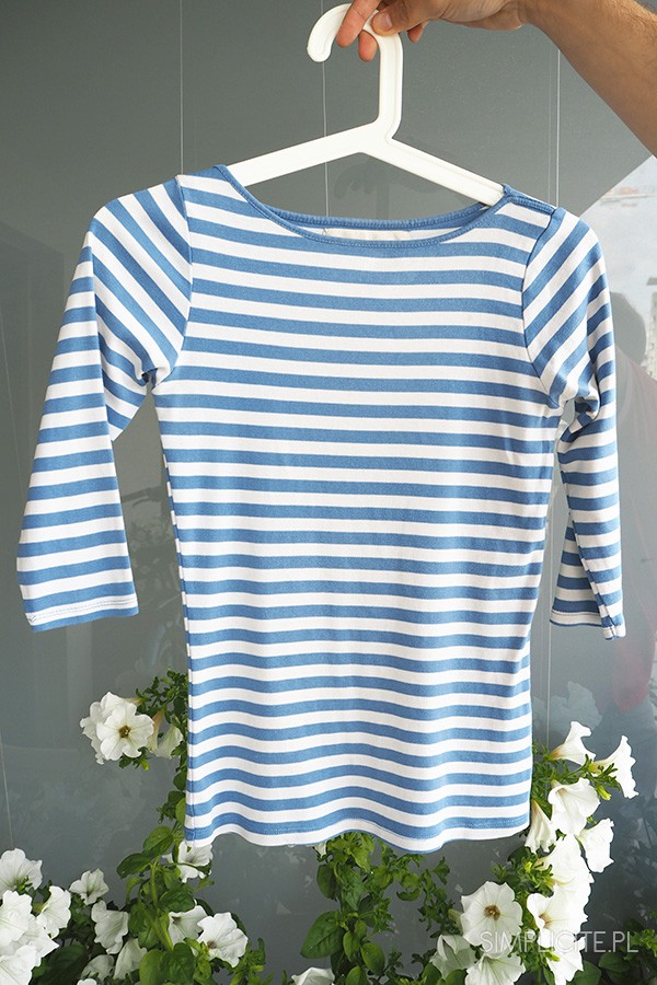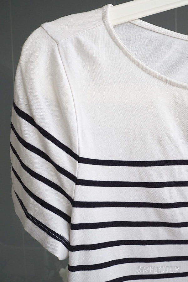 Koszulka w paski pochodzi z kolekcji damskiej, ale z serii z bawełny ekologicznej. Jest najstarsza, ma ponad 8 lat. Koszulki w tej serii są nadal sprzedawane, ale jakość… no cóż, już dawno nie ta sama. Mam porównanie, ponieważ zachęcona kupiłam ok. 4 lata temu też białą wersję i… wyrzuciłam bardzo szybko. Koszulka się dosłownie rozpadła po kilkunastu praniach – szwy puściły, materiał się rozlazł. Słowem – tragedia. Natomiast egzemplarz w paski, choć wyblakły i trochę zmechacony – służy mi nadal jako ubranko po domu i na spacery z psem.
