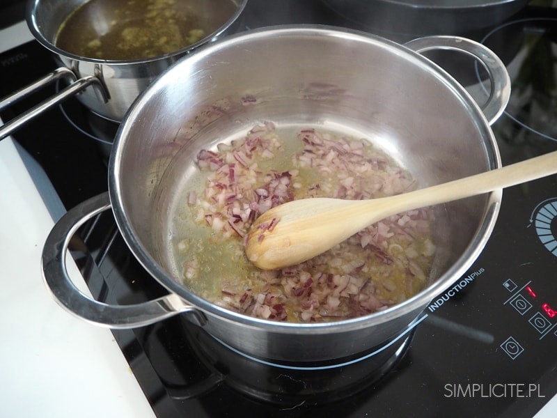 Połowę masła rozpuść w garnku, a potem dodaj poszatkowaną drobno czerwoną cebulę. W oryginalnej wersji jest biała cebula, ale smak czerwonej mi dużo bardziej odpowiada. Cebulę trzeba zeszklić na wolnym ogniu (u mnie to 3 na kuchence indukcyjnej), zajmuje mi to 5-7 minut. Wiem, na początku się dłuży strasznie. :)