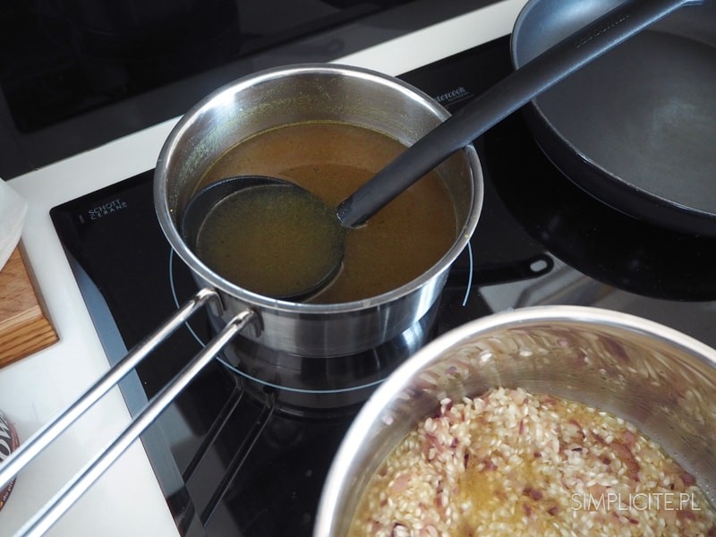 W międzyczasie przygotuj bulion w osobnym rondelku. Kostki wystarczy rozpuścić we wrzątku, a potem zostawić na maleńkim ogniu, żeby był cały czas ciepły.