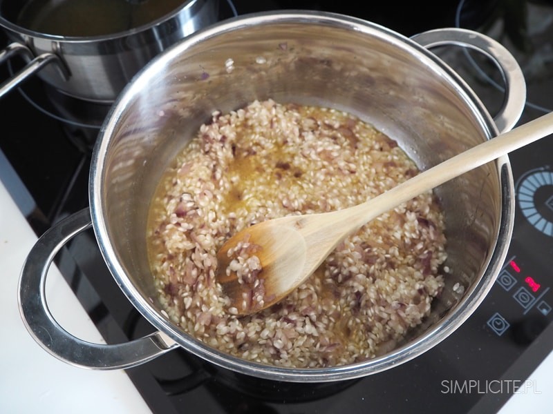 Gdy cebula się zeszkli, dodaj cały ryż i mieszaj z masłem i cebulą na wolnym ogniu. Nic nie może się przypalić. Gdy minie kilka minut (nie przyspieszaj) możesz dodać wino, jeśli lubisz. Cały czas mieszając zwiększ na chwilę ogień, żeby alkohol odparował (wtedy podbijam do 8 na płycie indukcyjnej). To jest najczęściej ten moment, gdy włączam wyciąg. ;)