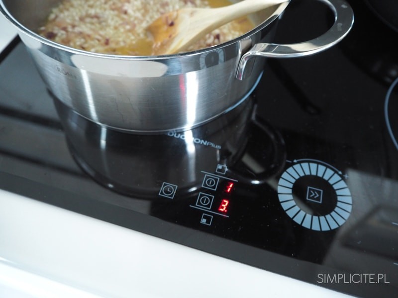 Znowu zmniejsz ogień i wlej pierwszą łyżkę wazową bulionu do ryżu. Gdy ryż wchłonie bulion, dodawaj kolejne porcje. Nie przyspieszaj, daj mu tyle czasu, ile potrzeba! Poza odparowaniem alkoholu w zasadzie cały czas mam płytę włączoną na 3 pod risotto i na 1 pod bulionem.