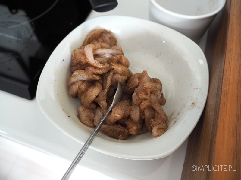 W międzyczasie obtocz kurczaka pokrojonego na drobne kawałki w przyprawach i usmaż na patelni. Odsącz na papierowym ręczniku ze zbędnego tłuszczu (smażę również na klarowanym maśle).