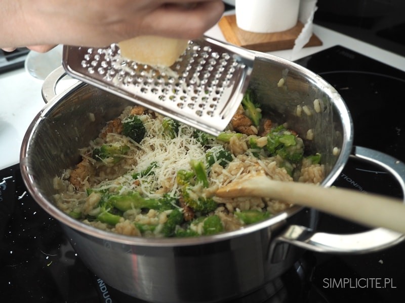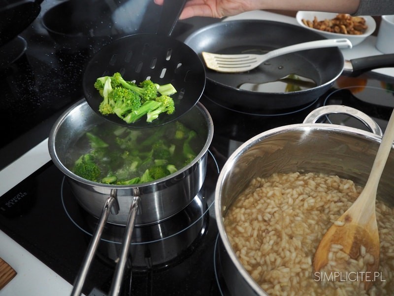 Po dodaniu kolejnych porcji bulionu, gdy ryż będzie już prawie al dente, dodaj ostatnią łyżkę bulionu, a do garnka z pozostałym bulionem (z reguły trochę zostaje) dolej wody (po co brudzić kolejny garnek), zagotuj i wrzuć pokrojonego na kawałki brokuła do wrzątku na ok. pół minuty.