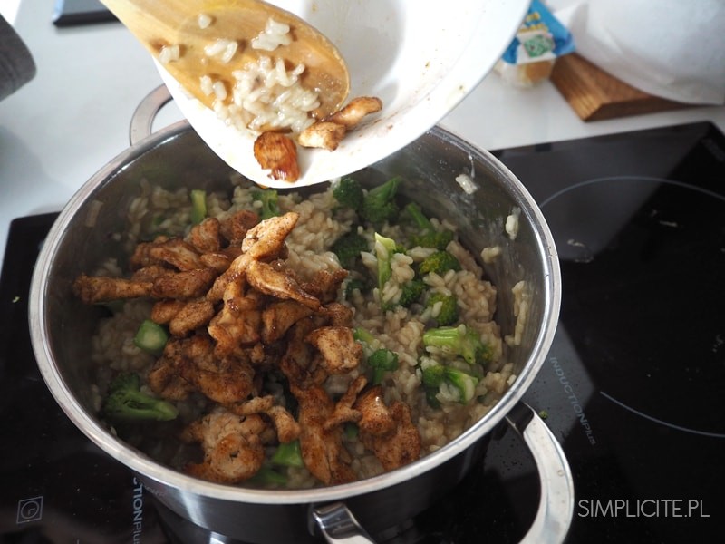 Zblanszowanego brokuła dorzuć do ryżu, dodaj wcześniej usmażonego kurczaka, dołóż pozostałą połowę masła, zamieszaj i zostaw na chwilę pod przykryciem.