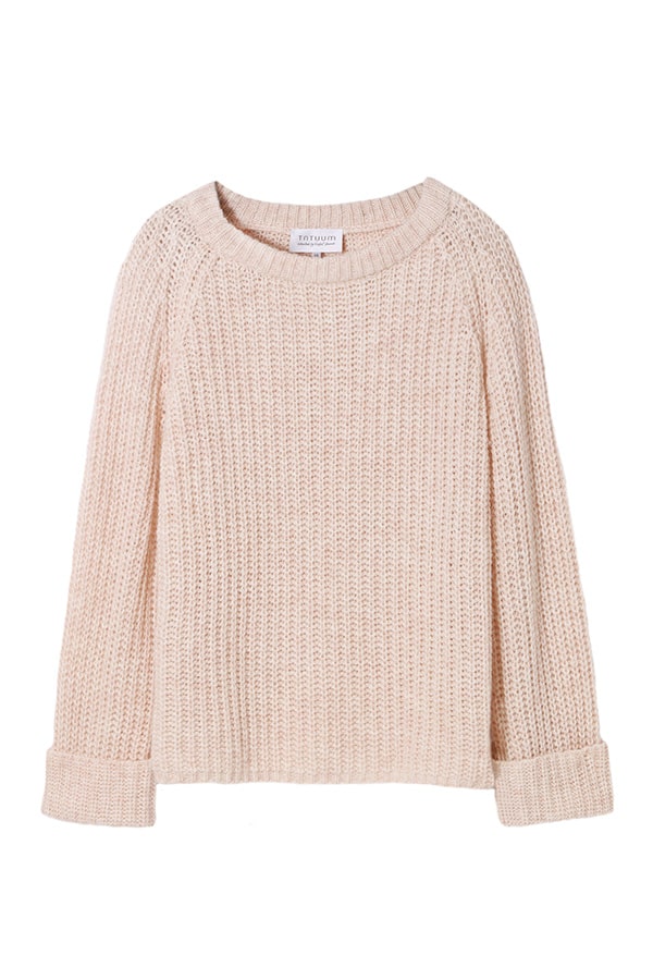 4. Sweter Perla – 43% wełna, 42% nylon, 8% moher, 7% alpaka. Sweter ma fason oversize, z szerokimi rękawami. Można bardzo przyjemnie i nonszalancko opuścić na jedno ramię.