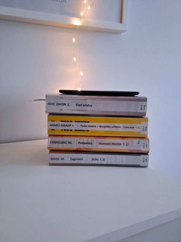 Nie wiem dokładnie, ile bibliotekowych książek przeczytaliśmy w ciągu ostatniego roku (bo czytaliśmy też te pożyczone od znajomych i kupione), ale spokojnie celowałabym w pięćdziesiąt. Na zdjęciu aktualna kupka, wcale nie tak imponująca, bo odkryłam, że można wypożyczać też ebooki, z czego skrupulatnie korzystam!
