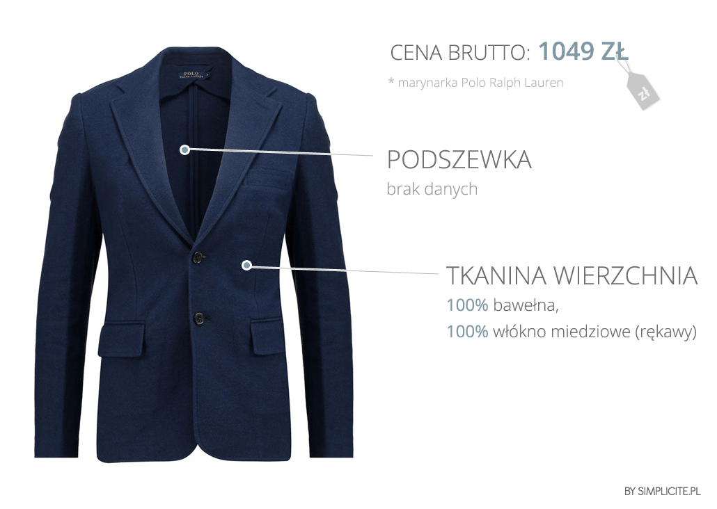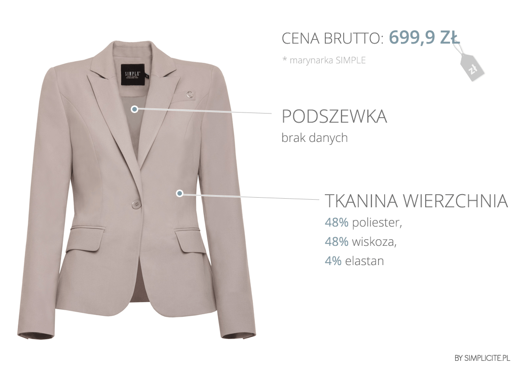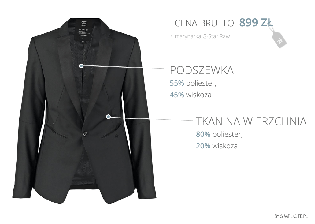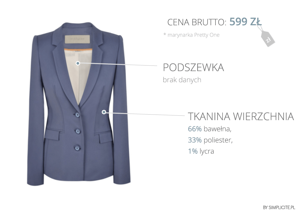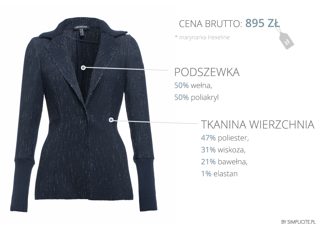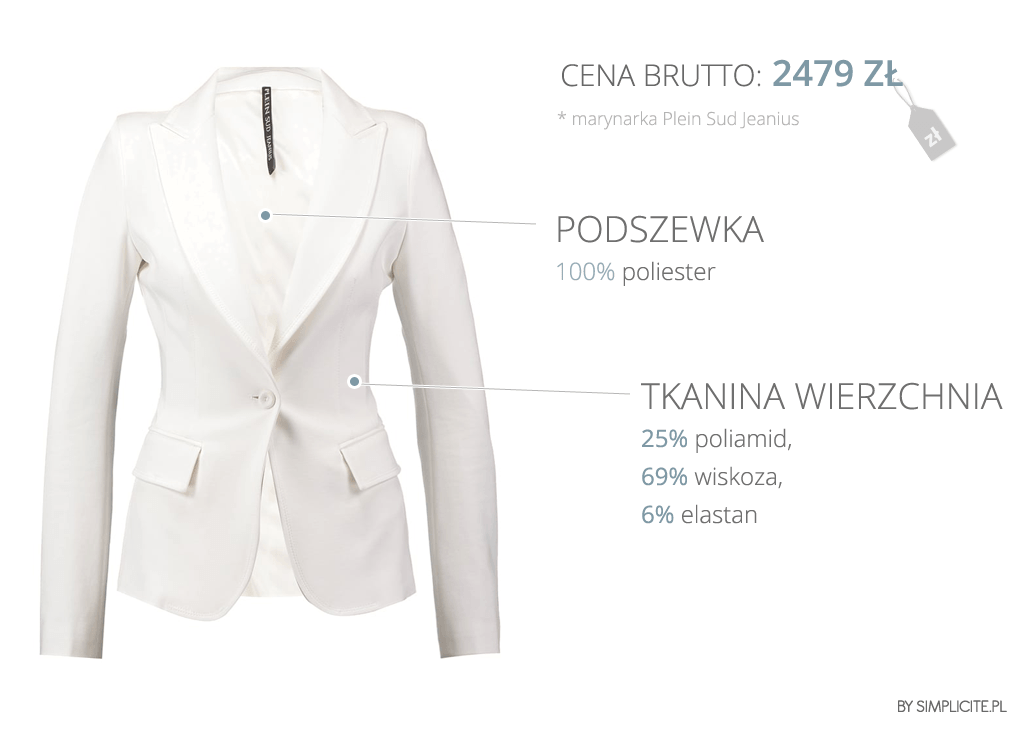 W żadnej z marynarek nie znajdziemy ani grama wełny, która jest właściwie podstawowym materiałem, z którego należałoby szyć eleganckie marynarki. Króluje poliester, wiskoza, acetat, ewentualnie bawełna. Naprawdę, nie byłam złośliwa. Szukałam „lepszych” marynarek i zwyczajnie ich nie znalazłam. Specjalnie umieściłam w zestawieniu naprawdę drogą marynarkę marki Plein Sud Jelanius (cena: 2479 zł), która zrobiona jest z mieszanki poliamidu, wiskozy i elastanu, na poliestrowej podszewce. Nie jest ona wyjątkiem wśród drogich marek. W tym przypadku nie wiem, w jaki sposób uzasadnić tak wysoki koszt produktu, poza monetyzowaniem marki, czyli płaceniem „za logo”.
