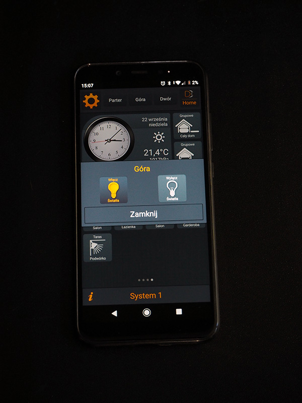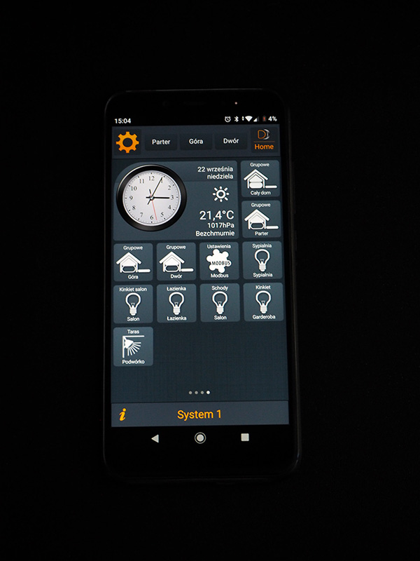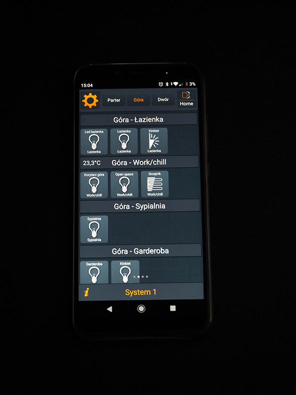 Jak wyszło? Ano jak to w życiu często bywa udało się… częściowo. :) Gazu jeszcze nie mamy więc nie ma czym sterować, o zaworze wody zapomniał hydraulik, rekuperator odmawia współpracy itd. Jak widać, jeszcze trochę wyzwań przed nami, ale to wszystko jest do zrobienia. Na ten moment cieszymy się możliwościami systemu, które ciągle testujemy. Najfajniejszą opcją są przyciski, które można dowolnie programować. Wyłącznie wszystkich świateł w domu jednym przyciskiem – żaden problem! Obsługa całego oświetlenia z telefonu – jest! Ta funkcja jest naprawdę niesamowicie przydatna w momencie, kiedy po ciężkim dniu kładziesz się do łóżka i nagle orientujesz, że światełko na dole wymaga Twojej atencji. Jesteś eko więc nie możesz go zostawić, oczywiście! Wtedy telefon, który zawsze jest gdzieś pod ręką, aplikacja i jedno kliknięcie. Przy okazji sprawdzasz temperaturę w domu (wszystkie przyciski mają wbudowane czujniki temperatury), żeby upewnić się, że włochacz na dole, który oczywiście śpi na kanapie (co jest zabronione) ma przyjemnie ciepło.