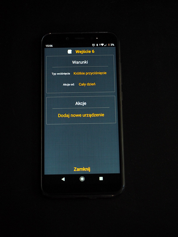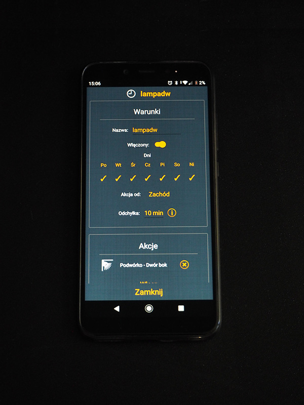 Natomiast bardzo przyjemną możliwością jest także programowanie czasowe. Na ten moment korzystamy skromnie – ustawiliśmy automatyczne włączanie się światła na zewnątrz wraz z zachodem słońca (system jest podłączony do internetu więc wie, kiedy to następuje) i wyłączanie wraz ze wschodem. W ten sam sposób możesz sterować też np. zraszaczami trawnika.