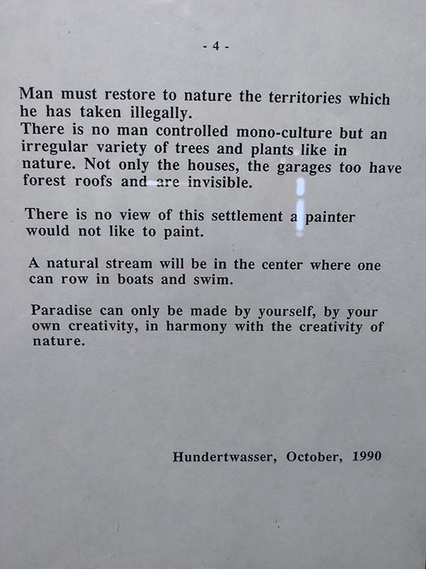 Żył i tworzył w latach 1928-2000, ale jego idee bardziej pasują do współczesnych czasów, a nawet je wyprzedzają. Jego wizja sztuki działającej na rzecz ochrony środowiska naturalnego jest poruszająca. Fascynowała go forma spirali, linie proste uważał za obrazę dla Boga i naturalnego porządku. Twierdził, że równe podłoże to grunt dobry do poruszania się maszyn, nie człowieka, dlatego podłogi w jego muzeum mają pofalowaną formę. Po śmierci, zgodnie z testamentem, został pochowany nago i bez trumny pod drzewem na terenie jego posiadłości w Nowej Zelandii. Chciał po śmierci wrócić do natury i stać się jej częścią.