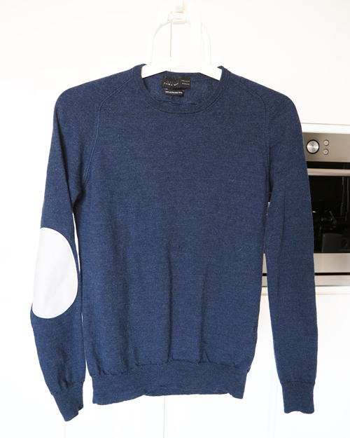 - sweter (doszycie łatek na rękawach),