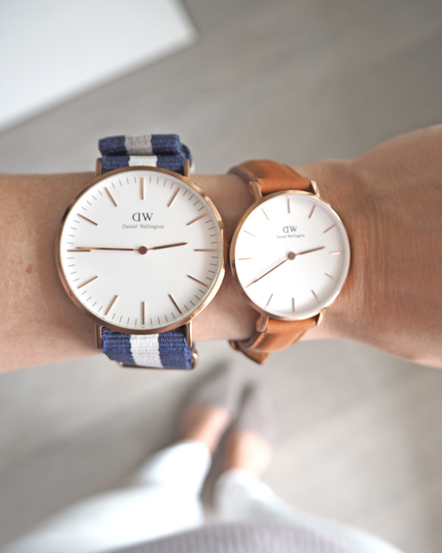 Noszony przeze mnie model zegarka to rozmiar 40mm. Podstawa to biała tarcza w oprawie w kolorze różowego złota, zmieniam jedynie paski. Wyjaśniam, ponieważ ktoś mi ostatnio zarzucił, że widać na zdjęciach, że mam dużo więcej akcesoriów, niż opisuję. Zatem prostuję – to ten sam zegarek, tylko z różnymi paskami. :) W ofercie Daniel Wellington są też mniejsze rozmiary. Na zdjęciu poniżej możecie zobaczyć porównanie rozmiarów. Ten mniejszy to nowość – Classic Petite Durham 32 mm, który zamówiłam na prezent dla pewnej bardzo młodej damy. :)